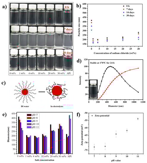 Moreover, the average hydrodynamic diameters of SiO2-g-SPMA dispersed in salt solutions varied with ionic strength (Figure 5b), which was attributed to the conformational changes of the brush polyelectrolytes affected by the ionic strength [37]. When the salt concentration was below 4.0 wt%, the hydrodynamic diameter of polyelectrolytes was decreased with increasing ionic strength. For high salt concentrations (above 10.0 wt% NaCl), the polymer brushes’ behavior was affected by the electrostatic interactions of chains and the excluded volume of the polymer backbone [38,39]. The positive excluded volume led to an increased thickness of brushes, thus the hydrodynamic diameters of particles were increased with increasing ionic strength owning to the excluded volume effect in high salt concentrations (above 10.0 wt% NaCl) (Figure 5b) [40,41]. Nevertheless, the average hydrodynamic diameters of SiO2-g-SPMA dispersed in API brines and 30 wt% NaCl solution was kept at 219 ± 2 and 280 ± 8 nm, respectively. The results demonstrated that anionic polymer-modified silica possessed excellent colloidal stability in concentrated brine.