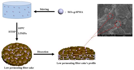 The plugging tests of SiO2-g-SPMA were conducted on the above prepared low-permeating filter cake (LPFC) with micropores and nanopores. Firstly, a series of aqueous dispersions with 0.1, 0.2, 0.3, 0.4, and 0.5 wt% SiO2-g-SPMA were prepared. Then the different concentration SiO2-g-SPMA dispersions were respectively added in the HTHP filter, allowing the SiO2-g-SPMA dispersion to flow through above low-permeating filter cake (LPFC) at 105 °C under a pressure of 3.5 MPa. Afterward, the volumes of filtrate at each 5 min interval were recorded, sustaining for 30 min. When the test was finished, the fresh filter cake was carefully removed from the HTHP filter and digital images were taken immediately. The thickness of the filter cake was also confirmed by an electronic caliper. After adding SiO2-g-SPMA as the nano-plugging agent, the permeability (K′) of filter cake was also calculated according to Darcy’s Law (referred to above calculation method in Supplementary Materials (Equation S1).