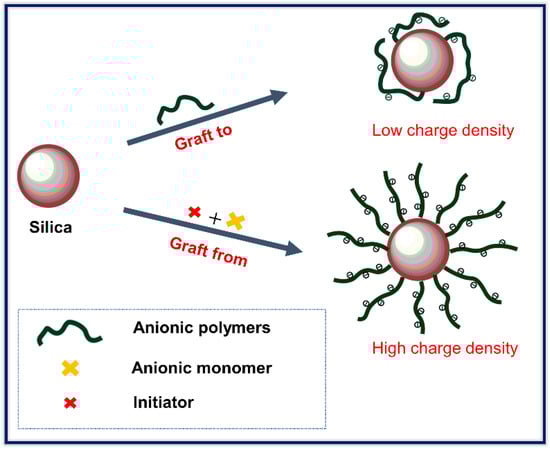 As mentioned above, previous studies applied the graft to approach, however, a small amount of polymer grafted on particle surface due to steric hindrance of polymers resulted in low grafting density on particle surface as well as less steric and electrostatic repulsion. This method cannot enhance the stability of silica in extreme environments. In order to improve the stability of silica in extreme environments, the graft from method, surface-initiated atom transfer radical polymerization (SI-ATRP) was devised to graft anionic polymer on silica. Well-controlled molecular weight, more polymer chains and high charge density on silica could be achieved [27,28,29] (Scheme 1) using this method. The poly (3-sulfopropyl methacrylate potassium salt) p(SPMA) with many sulfonic groups (negatively charged groups) has strong hydration capability and can resist flocculation at high temperatures. Thus, p(SPMA) can be fully stretched in aqueous solution and provide steric and electrostatic repulsion to stabilize nanoparticle suspensions [30].