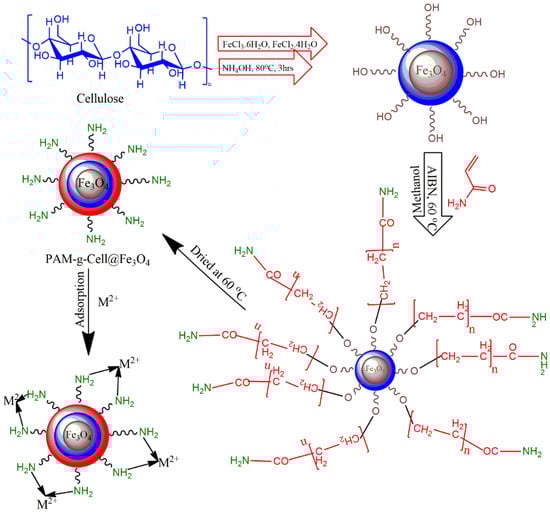 The proposed nanocomposite was fabricated via in situ oxidative free radical polymerization of acrylamide monomers within the vicinity of Cell@Fe3O4 nanoparticles [30]. Cell@Fe3O4 nanoparticles (8 g), acrylamide (6 g), and azobisisobutyronitrile (0.04 g) were introduced to a three-necked round-bottomed jar containing 100 mL of methanol, with an attractive bar and reflux condenser. The flagon was exposed to nitrogen for 20 min to maintain a vacuum environment and to remove any air pockets. This process was continued by mixing the blend at 60 °C for 6 h. After completion of the process, the blend was transferred into a Soxhlet device and deracinated using 60:40 DMF (dimethylformamide)/water for 72 h. The incorporated powdered material was then dried at 60 °C for 24 h in a vacuum oven. The complete synthesis and adsorption mechanism of the material is proposed in Figure 1.