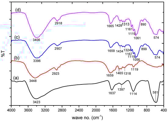 FTIR spectra of: (a) Fe3O4; (b) poly(acrylamide); (c) poly(acrylamide)-g-Cell@Fe3O4 (PAC@Fe3O4); and (d) PAC@Fe3O4-Pb.