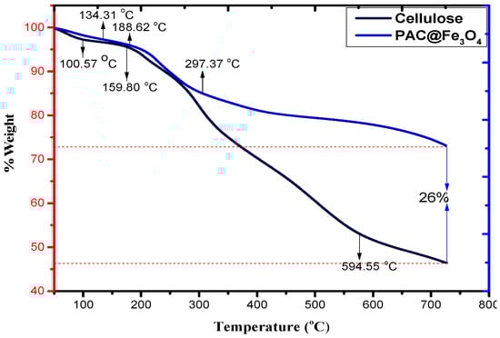 Thermogravimetric techniques are effective strategies for illustrating the temperature response of a material to heat. Figure 5 shows the TGA spectra of cellulose and PAC@Fe3O4. From this figure, it is evident that the deterioration of pristine cellulose occurs in two stages. The initial step at 100.57 °C occurs because of the loss of hydrated and constituent water. The second stage involves weight reduction that occurs at approximately 159.80 to 594.55 °C. This is generally associated with the deterioration of cellulose (natural carbon) under oxidizing conditions [46]. Disintegration past 594.55 °C occurs because of oxidation of the decayed products of cellulose. In addition, PAC@Fe3O4 also undergoes a two-stage deterioration, as the first one indicated by a peak at 134.31 °C is due to the loss of water molecules. The second step occurs at approximately 188.62 to 297.37 °C, which can be inferred from cellulose deterioration. Weight reduction at more than 297.37 °C decreases because of the exceedingly stable spinel-organized Fe3O4 nanoparticles in the framework of the biopolymer. For the correlation of TGA thermograms of cellulose and PAC@Fe3O4 nanocomposites, it was determined that on average, 26% of the Fe3O4 nanoparticles are available in the polymer framework.
