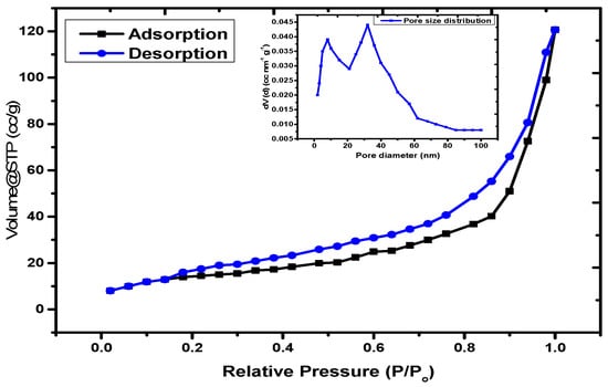 The surface area and porosity of the material can be evaluated using the N2 adsorption–desorption curve at low temperature. The assembled isotherm and pore size distribution controlled by using the BJH model is illustrated in Figure 6. The data reveals that the material can be considered as a mesoporous solid with a type IV isotherm based on to the IUPAC nomenclature, with pore closeness of various breadths [47]. From the literature, the surface territory and porosity of neat Fe3O4 nanoparticles were observed to be 286.9 m2/g and 0.6928 cm3/g, respectively [48]. The normal hysteresis circle for this case is type H1, which is related to the permeable materials that display a limited dispersion of moderately uniform round and hollow pores [49]. The BET surface region of the nanocomposite produced by the N2 adsorption–desorption technique was determined to be 65.89 m2/g, with a BJH porosity of 0.073 cm3/g. The surface zone and explicit pore volume of Fe3O4 diminished in the PAC@Fe3O4 nanocomposite because of the disappearance of the nanoporosity of Fe3O4 nanoparticles due to functionalization with the PAM-g-Cell polymer lattice.
