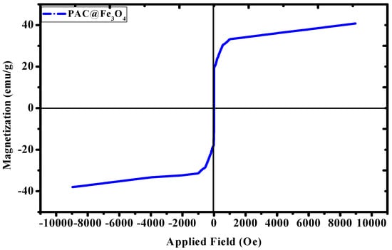 The magnetic property of the material was analyzed by using a vibrating sample magnetometer (VSM) PAR 155 (Quantum Design, Manchester, UK) in the range of −10000 to +10000 Oe. The magnetic hysteresis (M–H) loop indicates that the material is showing ferromagnetic behavior at room temperature [50]. The saturation magnetization (ms) value of Fe3O4 MNPs depends upon the synthesis protocol and type of non-magnetic groups attached to their surfaces [51]. From the literature, it was found that the ms value for bare Fe3O4 MNPs was 56.8 emu g−1 [52], 75 emu g−1 [53], 71.2 emu g−1 [54], and 56 emu g−1 [55], based on the difference in synthesis protocol. While looking at the Figure 7, the ms value for the PAC@Fe3O4 was found to be 40.80 emu g−1. The decrement in the ms value of bare Fe3O4 magnetic nanoparticles (MNPs) suggests the functionalization of non-magnetic polyacrylamide-g-cellulose matrix on the surface. Thus, based on the VSM studies, it was concluded that there is a correlation between Fe3O4 MNPs and the polymer matrix, with a negative synergistic effect on magnetic properties due to the presence of non-magnetic mass.