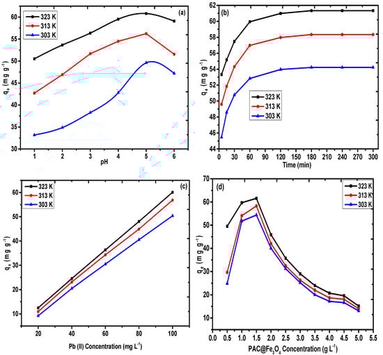 The pH of the process is the elementary variable in the sequestration response and the impact of this parameter was analyzed for values in the range of 1–7 with a precision of ±0.1, by keeping the other variables constant in the temperature range of 303–323 K. Figure 8a depicts the impact of pH on the sequestration rate of Pb(II) on PAC@Fe3O4. The sequestration rate of Pb(II) increased with the increase of the pH to a maximum value of pH 5 for Pb(II), because of the protonation of hydroxyl and carboxyl functional groups on the exterior of PAC@Fe3O4. Contrary to the experimental results, beyond pH 5, the take-up rate will decrease overall because of the complexation of metal ions as hydroxide. Therefore, the pH of 5 was selected as the ideal pH for Pb(II) for further examinations, because the best adsorption efficiencies of 60.82 mg g−1 at 323 K, 56.24 mg g−1 at 313 K, and 49.6 mg g−1 at 303 K were observed at this pH.