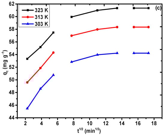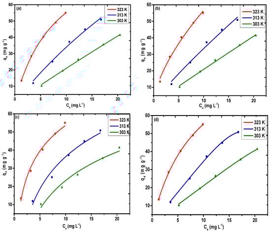 According to the Langmuir model, a reversible chemical equilibrium exists between the surface of the material and the bulk solution, which is only limited for a finite number of active sites. The non-linear plot (Figure 9a) for the Langmuir model was selected for Pb(II) based on non-linear regression. It can be observed from Table 2 that the highest monolayer adsorption capacities (qm) controlled by the Langmuir model are 314.47, 239.34, and 100.79 mg g−1 for Pb(II) at 323, 313, and 303 K, respectively.