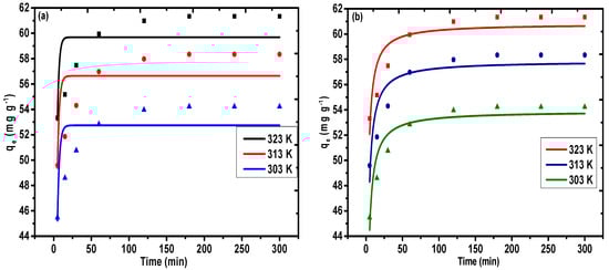 The agitation time is a pivotal variable that represents the impact of the adsorption. To determine the ideal time for maximum adsorption, a batch technique was performed that utilized 1.5 g L−1 of PAC@Fe3O4 in Pb(II), with a concentration of 100 mg L−1 in a temporal range of 5–300 min and a temperature range of 303–323 K. The extent of the accumulated Pb(II) was controlled using a mass balance equation, represented by Equation (1). This behavior can be presented as a graph of agitation time vs. adsorption capacity, as shown in Figure 8b. The sequestration of metal ions is highly energetic in the initial 180 min, due to the availability of active functional sites on the surface of the adsorbent. In the following stage, with the consistent decline in the number of active sites, the take-up of Pb(II) is moderate, and no further change in the take-up phenomenon was observed after 180 min. The adsorption limit was determined to be 61.34 mg g−1 at 323 K, 58.34 mg g−1 at 313 K, and 54.22 mg g−1 at 303 K, for an agitation time of 180 min. This duration was selected as the optimum time for the adsorption of Pb(II).