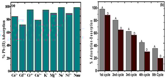 Figure 11a depicts the impact of various metal ions including Na+, K+, Mg2+, Ca2+, Cu2+, Cd2+, Ni2+, and Cr6+ on the % adsorption of Pb(II) by PAC@Fe3O4. It was discovered that in the absence of other co-ions, the adsorption of Pb(II) was approximately 99%. For 20 mL of 50 mg L−1 solution of NaNO3, the adsorption effectiveness of Pb(II) was observed to be 99%, indicating that the proximity of the sodium particles does not have a synergistic impact on Pb(II) adsorption. The proximity of 20 mL of 50 mg L−1 solution of KNO3 caused a decrease of the adsorption proficiency to 96% for Pb(II), demonstrating a less significant effect of K+ ions on Pb(II) adsorption. The presence of Mg2+ ions significantly impacts the adsorption of Pb(II) because of identical charge valence for a specific adsorption site on the surface of the material. The mg2+ particles significantly reduce the adsorption capacity of Pb(II) from 99% to 90%. With a larger size and competing valency, Ca2+ reduces the efficiency of the material towards Pb(II) from 99% to 85%. The presence of Cr6+ ions show a very small effect on adsorption of Pb(II) by asserting a decline of only 4% on Pb(II) adsorption. This may be due to the application of high pH (5) condition, as the optimized pH for Cr6+ adsorption lies in the range of 2.5–3.5 [59], while the presence of Ni2+, Cu2+, and Cd2+ show a minimal to significant effect on Pb(II) adsorption, with decreased values of 90%, 79%, and 70% from 99%. Again, the solution pH plays an important key role here, as the optimum pH for Ni2+ adsorption is in the range of 6–7 [60], while for Cu2+ it is 5.5–6.5 and for Cd2+ it is 6–8 [61,62]. Therefore, it was concluded that the presence of Ca2+, Cu2+, and Cd2+ in the wastewater can significantly affect the Pb(II) on PAC@Fe3O4 based on the pH condition of the system.
