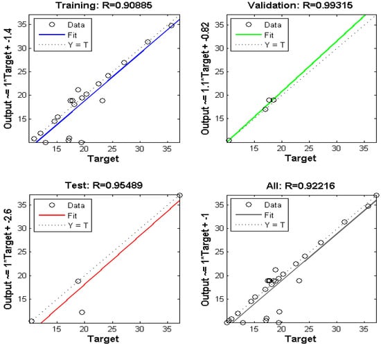 where y belongs to the systematized value of xi, and the minimum and maximum values of xi correspond to xmin and xmax, respectively. The mean square error (MSE) and regression coefficient (R2) were defined to check the performance of the ANN models and are given as follows [27,28]: