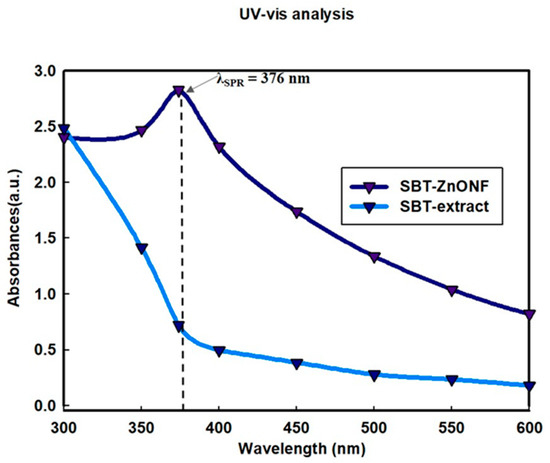 The formation of ZnO was confirmed by UV–vis spectroscopy. The SBT-ZnO/NF exhibited surface Plasmon resonance (SPR) as a result of collective oscillation of electrons of ZnO NPs and its interaction with certain wavelengths of light. The UV-visible spectrophotometer detected a maximum absorbance peak of SBT-ZnO/NF at 376 nm, using the wavelength range 300–800 nm indicating formation of SBT-ZnO/NFs from SBT fruit extract. However, the SBT fruit extract did not show an absorption peak in the region of ZnO/NF formation, as shown in Figure 2.