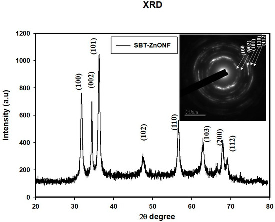 The XRD pattern in Figure 4 depicts the crystalline structure of NFs at 2θ values of 31.82, 34.41, 36.27, 47.55, 56.61, 62.82, and 67.97, which were indexed according to Miller indices (h, l, k) respectively at (100), (002), (101), (102), (110), (103), and (112) in a lattice plane. These value matched well with the standard values of JCPDS NO. 36−145 and the most intense peak at 36.27 belongs to the (101) orientation, and the position of the reflection peaks of SBT-ZnO/NF indicated a hexagonal wurtzite structure. The larger crystalline size is specified by the intense peak of the pattern. The FWHM results revealed from d (100) = 2.81 A°, d (002) = 2.60 A°, d (101) = 2.47 A° value with sharp and intense peaks were used to determine the size of SBT-ZnO/NF.
