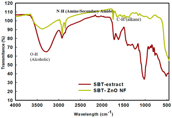 Fourier-transform infrared spectroscopic (FT-IR) peaks of SBT extract and SBT-ZnO/NFs in transmission mode.