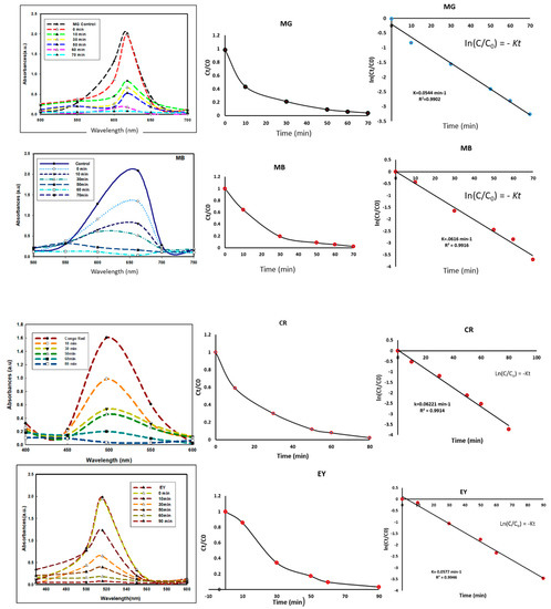 A 15 mg L−1 concentration of each dye (MG, MB, EY, and CR) was used. The chemical formula and maximum absorption of the dyes are supplied in Table 1.
