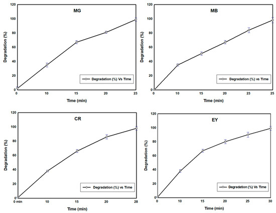 Kinetics study for all the four dyes follow the 1st order kinetics model which was confirmed from linear regression (R2 > 0.99) (Figure 9). There was a slight blue shift (shifted to higher frequency) in absorption spectra of all the dye molecules during degradation with respect to the time. That was in accordance with the previous study [26] and suggested that the blue shift is evidence for progressive degradation that occurred by removal of organic dyes [27]. For comparison, the dye degradation was also examined using ZnO-NPs and SBT fruit extract and the results were shown in Figure S2. SBT extract showed about 20% of dye degradation in all cases, whereas ZnO-NPs showed 60–70% efficiency. But SBT-ZnO/NF showed 100% degradation efficiency for MG, MB, CR and EY at 70, 70, 80, and 90 min, respectively. The higher degradation efficiency of SBT-ZnO/NF may be occurring due to the synergistic effect of the capping layer of phenolic compound (from SBT fruits) over the NF and the active sites of ZnO particles. SBT-ZnO/NF produced OH. (hydroxyl free radical) and O.2 (superoxide) molecules which are mainly responsible for dye degradation. At the lower concentration (5 mg/L) of dye using the SBT-ZnO/NF catalyst, we observed that MG, MB, CR and EY dyes were degraded by 100% within 23, 25, 28, and 30 min of contact time, respectively (Figure 10).