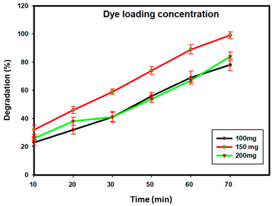 As a catalyst, SBT-ZnO/NFs have the potential to decompose several dye molecules in an advanced oxidation process. Catalyst concentration is an important parameter for assessing degradation activity. In this study, we measured different concentrations (100 mg/L, 150 mg/L, and 200 mg/L) of SBT-ZnO/NFs, where the highest catalytic activity was shown at 150 mg/L of MG, as in Figure 11. The results suggest that high catalyst load can increase catalytic activity by creating more active areas. However, use of more than 150 mg of catalyst may result in overlapping peaks and disturbance to UV rays at the surface of the semiconductor, decreasing the degradation rate. Additionally, SBT-ZnO/NFs showed superior photocatalytic activity to other plant extracts reported in previous reports (Table 3).