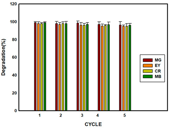 Test of the reusability of SBT-ZnO/NFs using 15 mg/L dye (MG, MB, EY, CR).