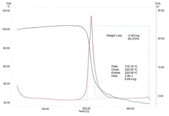 The TGA/DTA analysis showed that the resultant CN sample had a high decomposition temperature. The TGA curve had one exothermic peak at 210 °C, accompanied by the sample weight loss to 83%. The onset temperature of decomposition of the synthesized CN sample was 200 °C and extended to 220 °C. The obtained results are on a par with the experimental data for TGA/DTA of BNC-based CN [15].