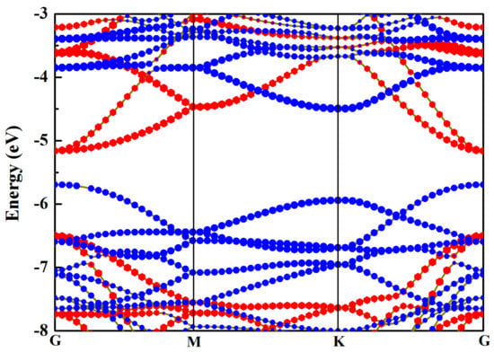 Projected band structure of the MoSe2/HfS2 heterostructure. The red hexagons and blue balls represent the energy bands of the HfS2 and MoSe2 layers, respectively.