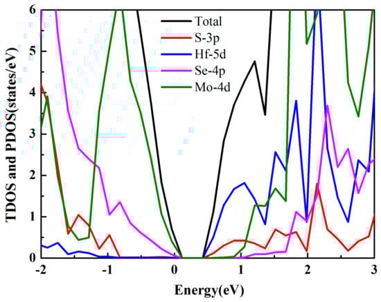 In order to systematically study the photocatalytic ability of the MoSe2/HfS2 heterostructure, we employed a density of states (DOS) analysis. TDOS and PDOS represent the total and partial DOS, respectively. As displayed in Figure 3, the VBM of this heterojunction chiefly consisted of the Mo 4d and Se 4p states, which were derived from the MoSe2 layer. However, the CBM was primarily made up of the Hf 5d and S 3p orbitals, which were rooted in the HfS2 slab. Thus, the VBM and CBM of this heterojunction were separated into different layers, which is consistent with the previous analysis about the band structure.