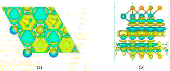 The effective separation of the photo-generated electron–hole pairs is an essential factor for improving the photocatalytic activity. Thus, we applied the charge density difference and Bader charge analysis to investigate the carrier migrating processes. The charge density differences of this heterostructure are defined as this: △ρ = ρMoSe2/HfS2 − ρMoSe2 − ρHfS2, where ρMoSe2/HfS2, ρMoSe2, and ρHfS2 indicate the charge density of the MoSe2/HfS2 nanocomposite, freestanding MoSe2, and HfS2 nanosheets, respectively. The small bandgap (0.53 eV) in this heterostructure was favorable to enhancing the interlayer carrier transfer. As depicted in Figure 4, there is obvious charge accumulation and depletion near the interface. The MoSe2 layer was apt to lose charge, while the HfS2 slab tended to gain charge. Hence, the charge transfer between two layers brought about an internal electric field pointing from the MoSe2 layer to the HfS2 slab, which is in accordance with the previous report that the electric field generally points from the hydrogen evolution catalyst to the oxygen evolution catalyst [25]. In order to evaluate the quantity of charge transfer, we employed the Bader charge analysis. The S and Se atoms were liable to acquire electrons, while the Hf and Mo atoms were apt to lose electrons. As a whole, the migrated electrons from the MoSe2 layer to the HfS2 slab were 0.052 e, which is in keeping with the charge density differences analysis.