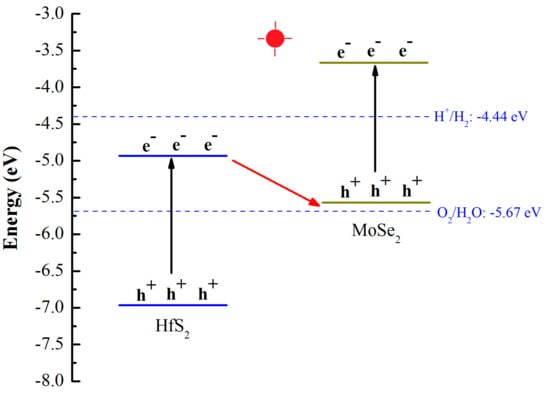 After the light irradiation, the electrons on the VB of MoSe2 and HfS2 slabs were excited to the CB of these layers. The internal electric field of the MoSe2/HfS2 nanocomposite was in favor of the electron migration from the CB of HfS2 to the VB of MoSe2. Meanwhile, the electric field hindered the electron transfer from the CB of MoSe2 to the CB of HfS2 and the hole transfer from the VB of HfS2 to the VB of MoSe2. Moreover, because the CBM of HfS2 and VBM of MoSe2 were close to each other (0.69 eV)—as displayed in Table 1—the photogenerated electrons in the CBM of HfS2 layer could easily recombine with the holes in the VBM of the MoSe2 layer. Finally, the photoinduced electrons in the CBM of MoSe2 slab and the holes in the VBM of HfS2 slab could both be preserved, which enabled the MoSe2/HfS2 nanocomposite to possess high redox ability. The schematic illustration of the Z-scheme photocatalytic mechanism for the MoSe2/HfS2 nanocomposite is illustrated in Figure 5. Therefore, in comparison with the MoSe2 and HfS2 monolayers, the MoSe2/HfS2 heterostructure can improve the separation efficiency of the photogenerated carriers and enhance the redox ability.