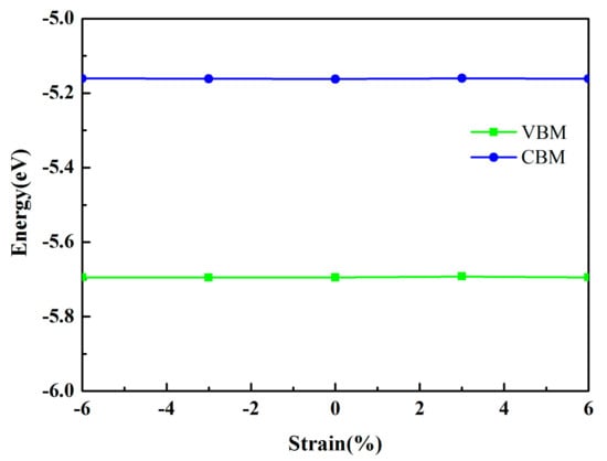 In addition, stress is inevitable in industrial production and may also originate from the mismatch of the lattices between different materials. Thus, we investigated the band edge positions of the MoSe2/HfS2 nanocomposite as a function of in-plain strains. By applying the strains in the range from −6% to 6%, the calculated band edge positions of the MoSe2/HfS2 heterostructure remained almost unchanged, as displayed in Figure 6. Thus, the band structures of MoSe2/HfS2 heterostructure are stable, which is different from the typical type II heterojunctions [11,15]. Therefore, the stable electronic property is in favor of future industrial applications.
