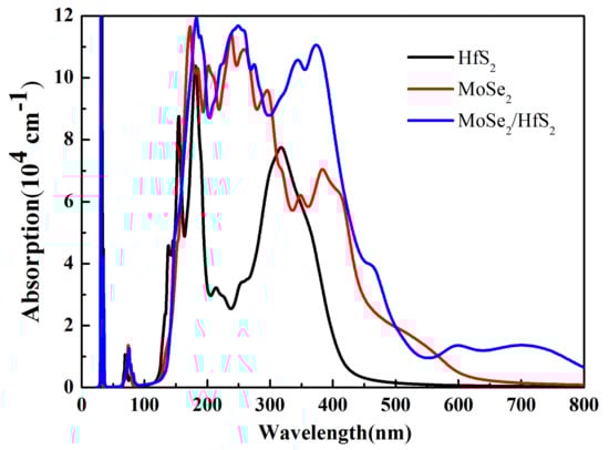 Optical absorption spectra are able to directly characterize the catalytic performance of photocatalysts. In this work, we employed the VASPKIT software to analyze the optical absorption properties. The optical absorption coefficient I(ω) can be acquired from the dynamical dielectric response function ε(ω), which can be expressed by this equation: . Compared with those of the HfS2 and MoSe2 monolayers, the optical absorption intensity of the MoSe2/HfS2 heterostructure is strengthened, especially in the visible and infrared region, as shown in Figure 7. Because the HfS2 single layer is an indirect semiconductor, the enhancement of the optical absorption mainly stems from the MoSe2 monolayer, which possesses a direct bandgap. Moreover, the evident red shift in this nanocomposite is mainly derived from the transition from the S 3p state to the Se 4p state. Furthermore, there are obvious absorption peaks even at 400 and 600 nm. Therefore, the MoSe2/HfS2 can take full advantage of the visible light.