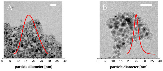 The particles presented in this work that are shown in Figure 1 have a core diameter of roughly 18 ± 4 nm with a coarse surface, which is formed during synthesis to increase the active surface of the particles and, thus, coordinate more citrate ligands to increase the stability. The size of the silica shell can be adjusted by the precursor concentration in the coating step. In this work, only silica coated core-shell particles with a shell thickness of 5 nm were used as a proof of principle, as the focus was on comparing the pure cobalt ferrite with ‘sealed’ cobalt ferrite to assess whether the particles themselves have toxic effects or the surface properties are more responsible for the appearing toxicity.