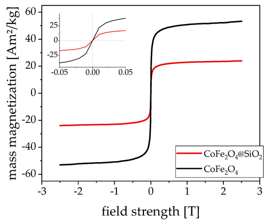 Static magnetization curve of CoFe2O4 (black) and CoFe2O4@SiO2 (red) normalized to the particle mass, not the magnetic content. The inlay zooms in on the zero passage, which shows no apparent remanence at room temperature.