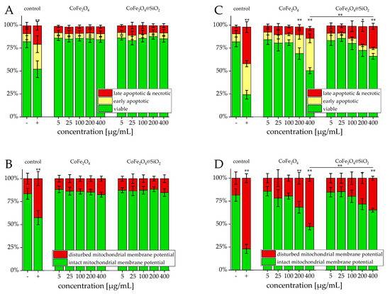 Viability of Jurkat cells after incubation with CoFe2O4 and CoFe2O4@SiO2 particles. Cells were incubated for 24 h (A,B) and 48 h (C,D) with increasing amounts of particles and analyzed by multiparameter flow cytometry. Viability was determined by AxV–FITC and PI staining (first row), yielding the percentage of viable (Ax− PI−), early apoptotic (Ax+ PI−), and late apoptotic and necrotic (PI+) cells. The status of the mitochondrial membrane potential was analyzed by DiIC1(5) staining and distinguishes cells with intact (DiIC1(5) positive) and depolarized (DiIC1(5) negative) membranes (second row). Positive controls contain 2% DMSO, and negative controls represent the corresponding amount of solvent instead of ferrofluid. The depicted concentrations are normalized to their respective particle concentration, not the magnetic content. Statistical significance of viability and intact membrane potential between negative control and samples and between the two particle systems are indicated with * p < 0.005 and ** p < 0.0005 and were calculated via Student’s t-test analysis with n = 8 for each shown sample.