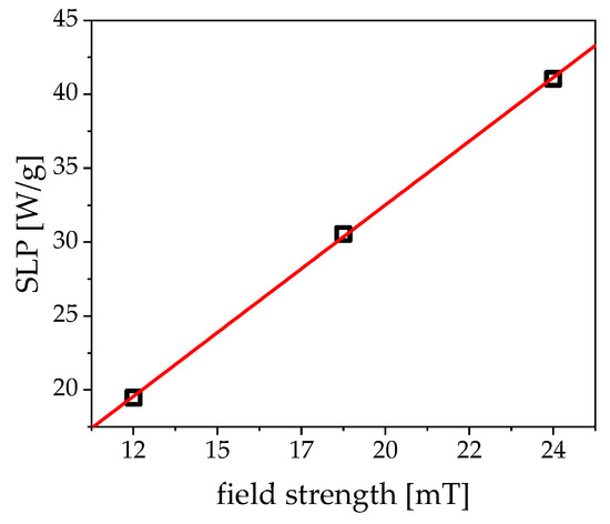 Calculation of the field dependent specific loss power (SLP) from the data of Figure 7. The red line depicts a fit function, estimating the linear dependence of the SLP to the field strength.