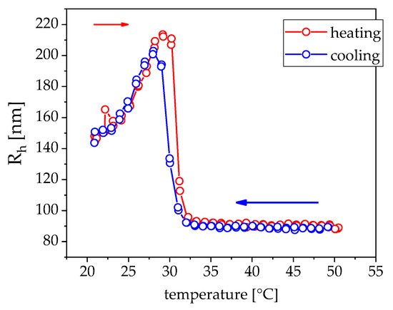 Hydrodynamic radius of pNipam gel beads in water mixed with 2.8 wt% CoFe2O4 (red line in Figure 10) in dynamic light scattering; the sample is first heated and then cooled down. The phase transition temperature of the gel is about 30 °C with a very small hysteresis.