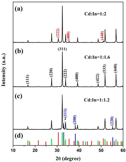 XRD patterns of the CdIn2O4 with typical Cd/In molar ratios of (a) Cd:In = 1:2, (b) Cd:In = 1:1.6, (c) Cd:In = 1:1.2, and (d) the vertical line represents JCPDS of In2O3 (71-2195, Red), CdO (75-0592, Blue), and CdIn2O4 (70-1680, Green).