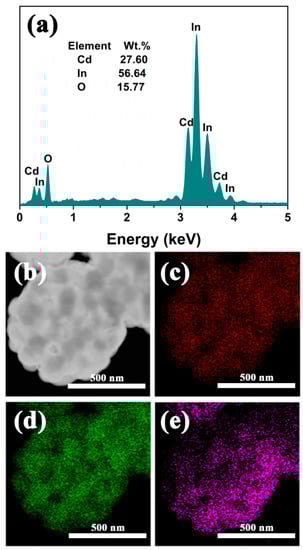 EDS analysis of CdIn2O4 spheres (a), and the elemental distribution mapping of Cd (c), In (d), and O (e) for a selected CdIn2O4 sphere (b).