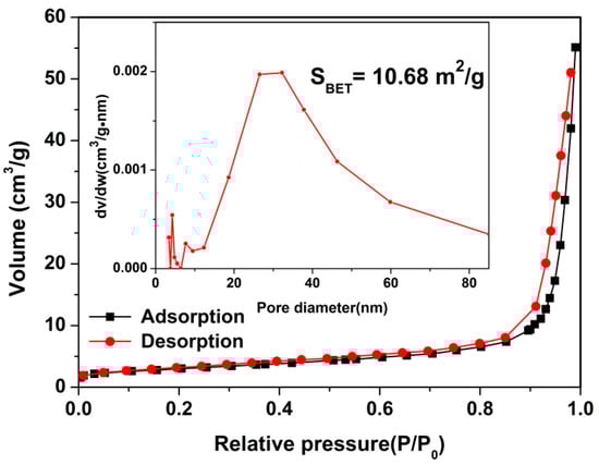 N2 adsorption-desorption isotherm of CdIn2O4 (inset shows the pore size distributions calculated by Barrett-Joyner-Halenda (BJH) method).