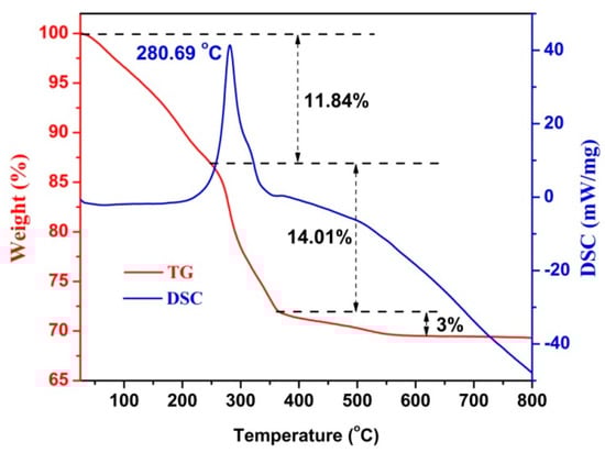 Figure 6 shows the TGA curve for the formation of CdIn2O4 in air with a heating rate of 10 °C/min. At the lower temperature ranges from room temperature to 225 °C, the Cd/In-glycerate exhibits 11.84% weight loss, which is attributed to the adsorbed or entrapped organic solvent, as well as water. A large weight loss of 14.01% occurs when the temperature further increases to 365 °C. Meanwhile, an exothermic effect can be noticed in the Differential Scanning Calorimeter (DSC) curve at 280.69 °C, suggesting the decomposition of the organic parts of the Cd/In-glycerate precursor [,]. Subsequently, a small loss of 3% in weight is observed at higher temperatures up to 600 °C, which is ascribed to the crystal of CdIn2O4. Thus, 28.85% weight loss is calculated in total after thermal treatment, due to the release of CO2 and water vapor, leading to the conversion of smooth Cd/In-glycerate to nanoparticles assembled in CdIn2O4 spheres.
