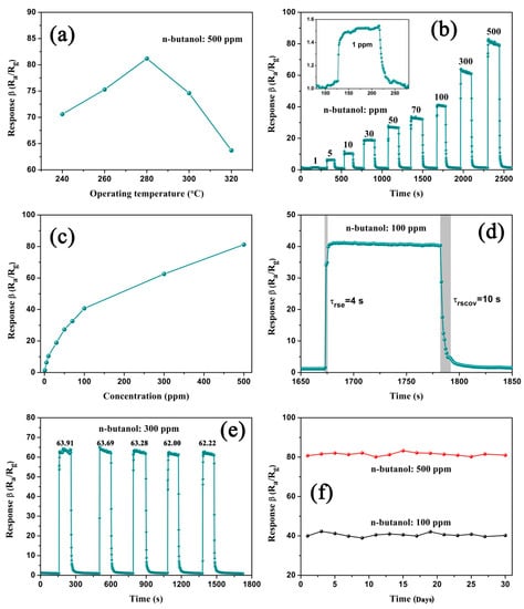 Based on the above structural features of CdIn2O4, it is expected to serve as a good gas-sensing material. Thus, the sensor device was fabricated using CdIn2O4 spheres as sensing materials, and n-butanol was selected as the detecting molecule. Because the operating temperature is a basic parameter for a gas sensor to determine the sensing performance, the gas responses to 500 ppm n-butanol were examined first (Figure 7a). Clearly, the response to n-butanol gas initially increases below 280 °C. Subsequently, it decreases when the temperature is further increased. With regard to the low temperature, the reaction between absorbed oxygen species on the CdIn2O4 surface and the gas molecules is not completely activated. However, the insufficient adsorption of gas molecules will reduce the response over high temperatures. Clearly, the maximum response of 81.20 is observed at 280 °C, which is considered the optimum temperature to investigate sensing-related properties in order to evaluate the gas sensor.