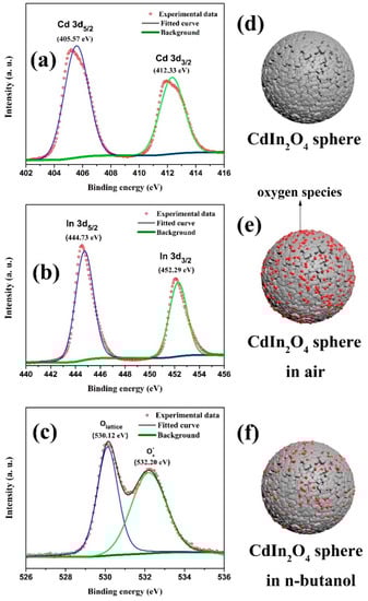 The XPS spectra of (a) Cd 3d, (b) In 3d, and (c) O 1s, and the schematic illustration of CdIn2O4 (d) sphere, (e) in air, and (f) in n-butanol.