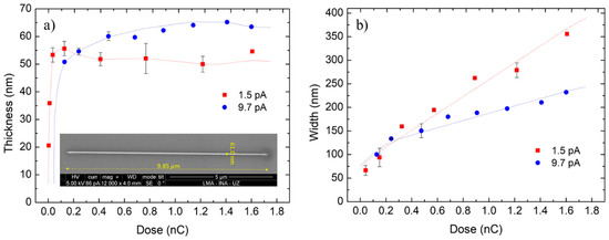 (a) Thickness and (b) width of Co-Focused Ion Beam Induced Deposition NWs (Co-FIBID NWs) as a function of the ion beam dose. The dimensions were directly determined while using the Dual Beam equipment measurement tools. The inset in (a) corresponds to a representative top-down SEM image of a Co-FIBID NW deposited with 1.5 pA, 0.017 nC.