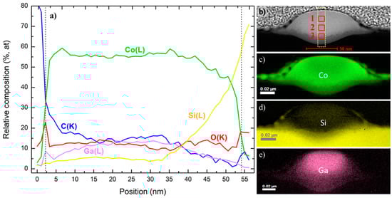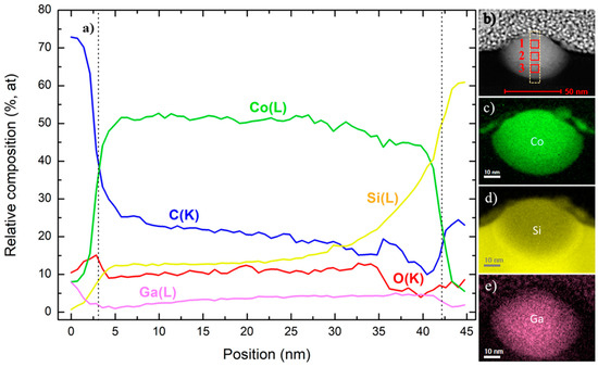 As for the NW of 9.7 pA, 0.224 nC (Figure 3a), the Co content is between 55–60 at. %, decreasing when approaching the substrate, similarly to the previous NW. C also diminishes along the cross-section, whereas O seems to be more homogeneously distributed. The Ga content (near 15 at. %) is greater far from the substrate (as shown in Figure 3e) and higher than in the 1.5 pA, 0.017 nC NW. Finally, the Si considerably increases when reaching the substrate, again as a result of the intermixing of the substrate and deposit (Figure 3b–d), in a similar way than for the NW of 1.5 pA, 0.017 nC.