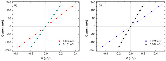 For the NWs of 1.5 pA (Figure 4a), the resistivities are (37.7 ± 12.0) µΩ·cm for 0.054 nC and (25.6 ± 3.6) µΩ·cm for 0.161 nC. In the case of 9.7 pA, the results are (24.5 ± 3.5) µΩ·cm for 0.021 nC and (18.8 ± 4.0) µΩ·cm for 0.064 nC.