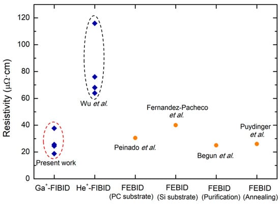 Comparison of the electrical resistivity values of Co-FIBID and Co-FEBID deposits grown under different conditions reported in the literature [29,30,33,34,39].