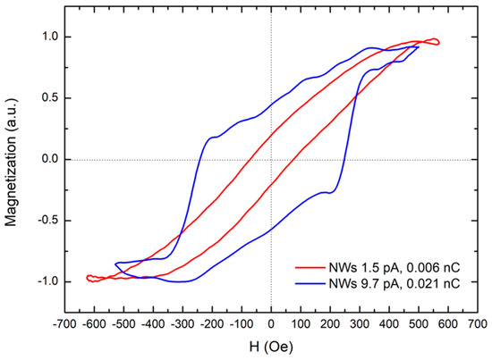 Figure 6 displays the MOKE loops of the Co-FIBID NWs, which were obtained after substraction of spurious high-field slopes and off-center compensation. The hysteretic behaviour proves the ferromagnetic nature of the NWs. Nevertheless, the loop shape is changing for NWs grown under different growth conditions, similarly to the coercive fields (HC): 72 Oe for 1.5 pA, 0.006 nC NWs and 251 Oe for 9.7 pA, 0.021 nC NWs. The different magnetic behaviour of the NWs can be explained by their shape [42], which has been explored, in detail, by SEM and TEM (see the Supplementary File). For the NWs grown under low current and ion dose, given their very small cross-sectional area, magnetization reversal through formation of magnetic domain walls and their propagation is unlikely. Instead, coherent rotation of the magnetization is more likely, whose signature is a small coercivity, as observed in Figure 6. The situation is different for the NWs that were grown under high current and ion dose. In this case, the NWs exhibit a higher coercive field and the hysteresis loop is unusual and it seems to be a combination of two contributions: (1) a first loop (narrow and similar to that of the 1.5 pA-NW) coming from the rounded, homogeneous part of the NW where the magnetization reversal is through coherent rotation; (2) a second loop (square-shaped, coming from the NW’s halo) where the magnetization reversal is through formation and the propagation of domain walls. The magnetic heterogeneity of high-dose NWs is likely to be a consequence of its irregular shape, which can be a limitation for those applications that require precise control of the magnetic stray field or the magnetization of the NWs. Moreover, the Ga contamination is expected to decrease the saturation magnetization of the NWs, which hampers applications that require high magnetization of the NWs.