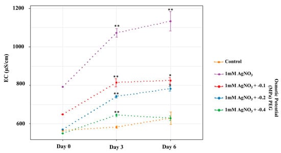 For all treated plants, the EC of the media increased on days 3 and 6 respectively compared to day 0, as shown in Figure 2. This increase in EC may be attributed to the attractive interactions between AgNPs and silver ions, suggesting increased AgNP numbers in the media [35,36]. EC was also observed to reduce under increasing PEG concentrations. This may be due to the presence of more unreacted silver ions at lower PEG concentrations [37]. In addition, on days 0, 3, and 6, the EC of control plant solutions was lower in comparison to treated plants, except at 0.4 PEG on day 6 which was similar to the control EC value. The lower EC values at higher PEG concentrations may be related to the interactions of the ions with PEG [38].