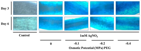 Evan’s blue staining assay of T. apollinea roots treated with 1 mM AgNO3 alone or with different concentrations of PEG corresponding to −0.1, −0.2, and −0.4 MPa respectively.