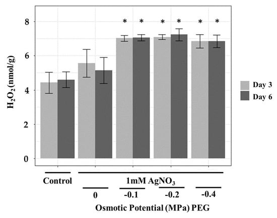 H2O2 contents in the roots of T. apollinea plants treated with 1 mM AgNO3 alone or with different concentrations of PEG corresponding to −0.1, −0.2, and −0.4 MPa. This figure was created using R [25].