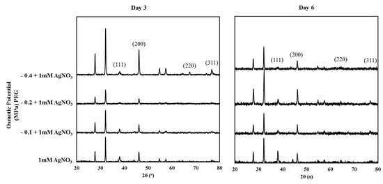 XRD patterns of the AgNPs synthesized exogenously by T. apollinea at day 3 and day 6. Plants were treated with 1 mM AgNO3 alone or with different concentrations of PEG corresponding to −0.1 MPa, −0.2 MPa, and −0.4 MPa. The XRD patterns showed diffraction peaks corresponding to the planes of Ag0 and Ag2O based on JCPDSV cards of Ag0 and Ag2O.