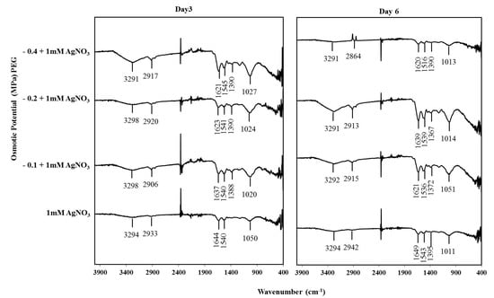 FT-IR spectra of silver nanoparticles synthesized exogenously by T. apollinea on day 3 and day 6 respectively. Plants were treated with 1 mM AgNO3 alone or with different concentrations of PEG corresponding to −0.1, −0.2, and −0.4 MPa.