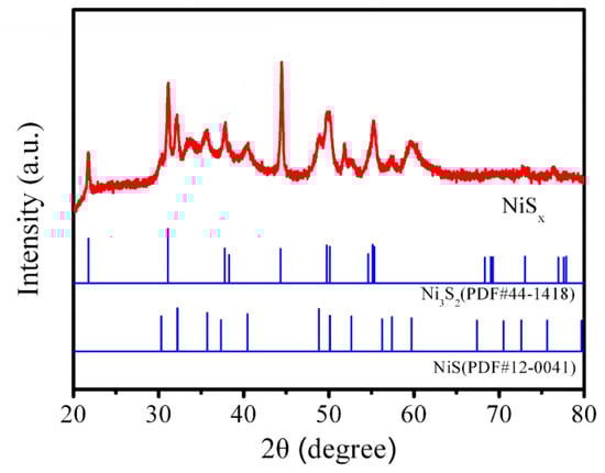The XRD patterns of the NiSx powder obtained from NiSx/NF electrode are shown in Figure 1. The diffraction peaks are well-matched with both Ni3S2 planes (PDF#44-1418) and NiS phase (PDF# 12-0041), confirming that the mixed phase of Ni3S2 and NiS was formatted in the as-prepared NiSx composite film. The impurity peaks at 51.8° are attributed to the (200) crystal planes of residual nickel metal (PDF# 04-0850) from Ni foam.