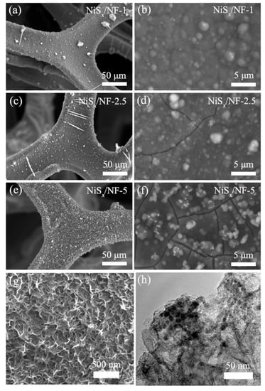 SEM images: (a–b) NiSx/NF-1, (c–d) NiSx/NF-2.5, and (e–f) NiSx/NF-5; (g) FE-SEM image of NiSx/NF; and (h) TEM image.